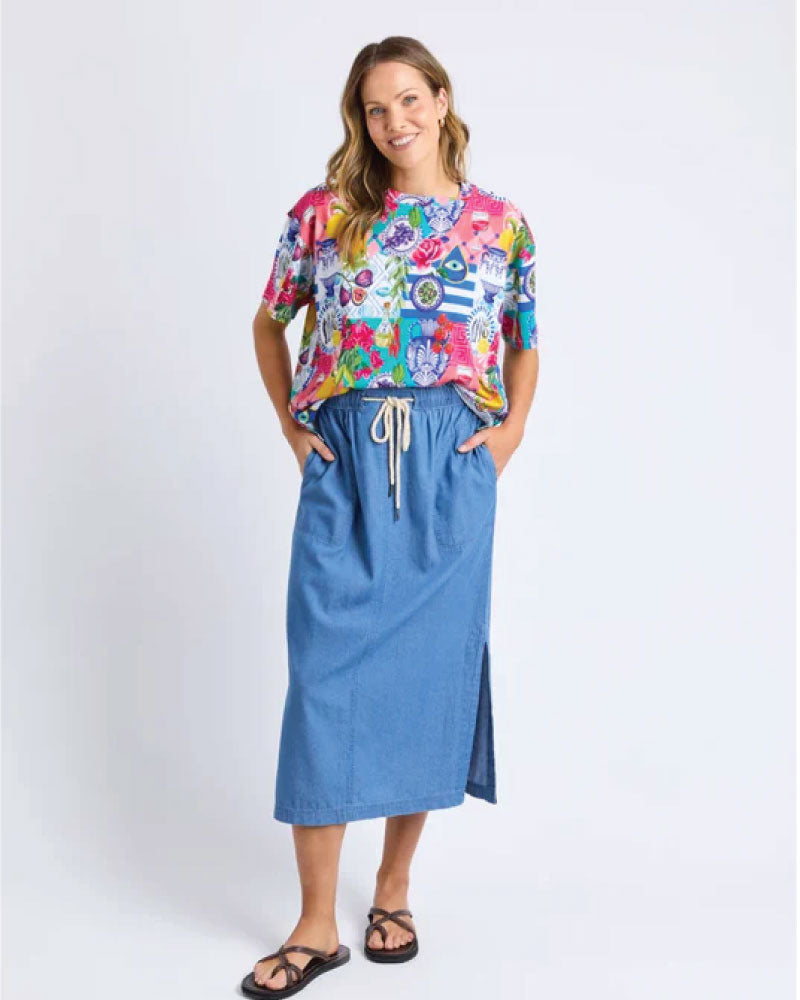 Elm Lala Land T Shirt Multi. Elevate your casual look with the La La Land Tee featuring a stunning all-over print inspired by European vibes. Its short sleeves make it perfect for warmer days, while the vibrant design pairs effortlessly with your favorite denim for a stylish and comfortable outfit. Make every day a little more colorful and chic with this versatile tee