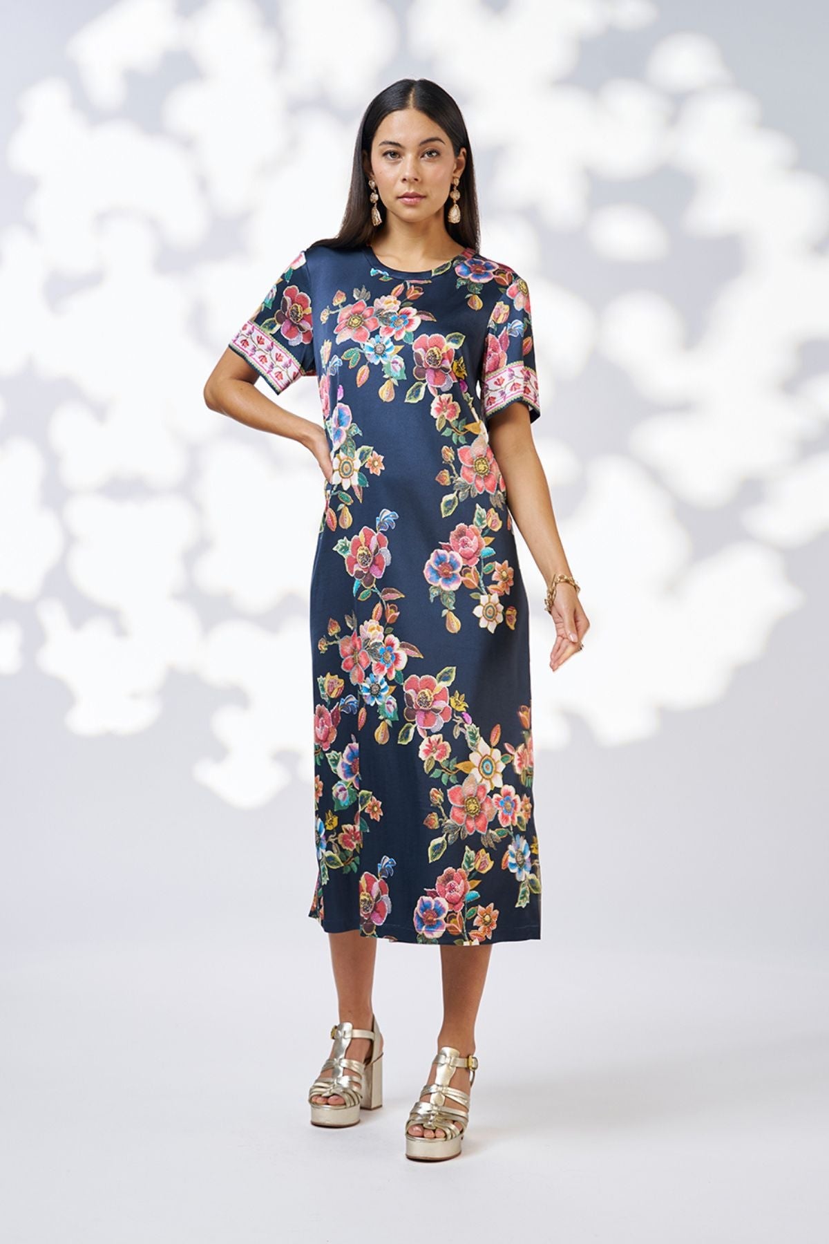 A luxe t-shirt style dress, in a silky printed stretch viscose. With bust darts, back neck opening and side splits to elevate.