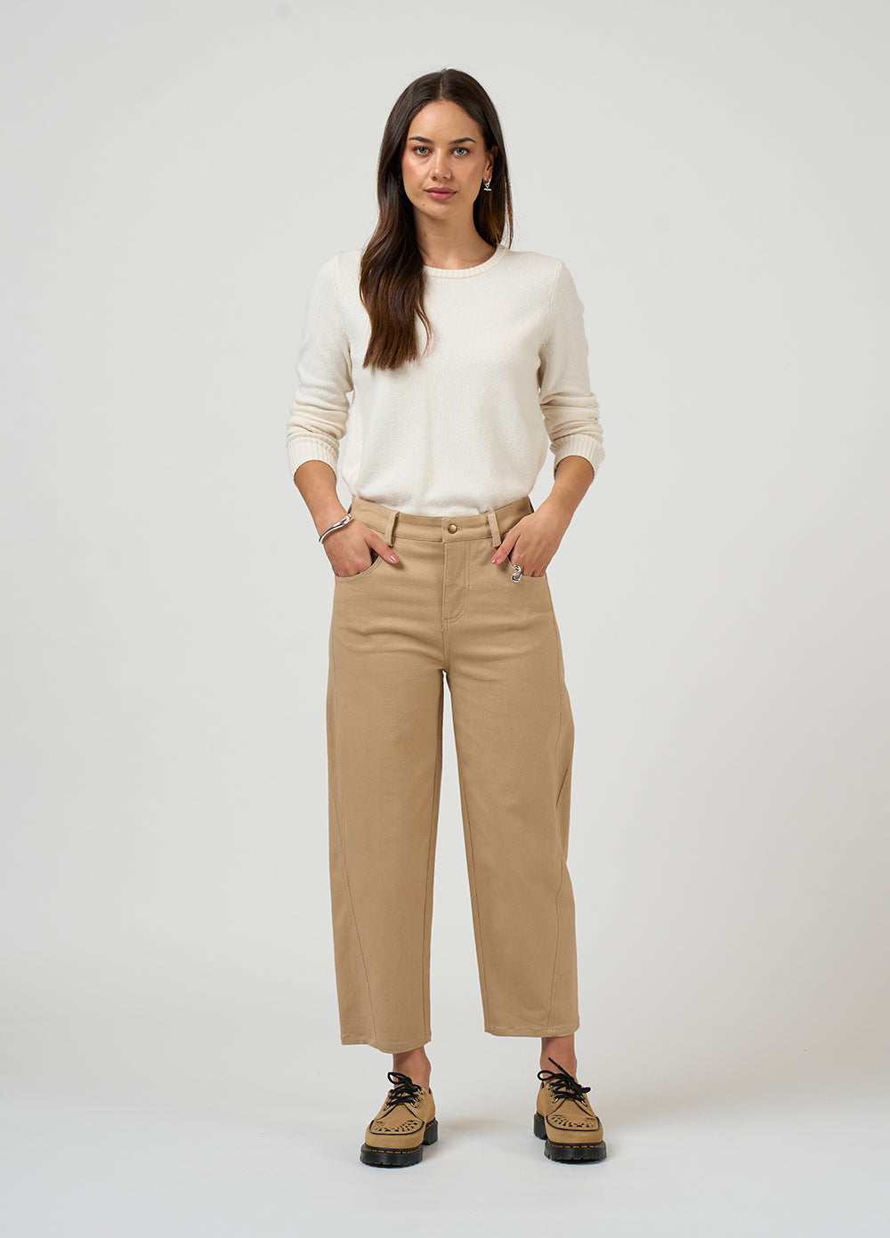 Stretch pant with a barrel style shaped leg, featuring angled seams that wrap around the leg, with jean-style pockets, top stitching and hardware and hem darts for a flattering leg line.