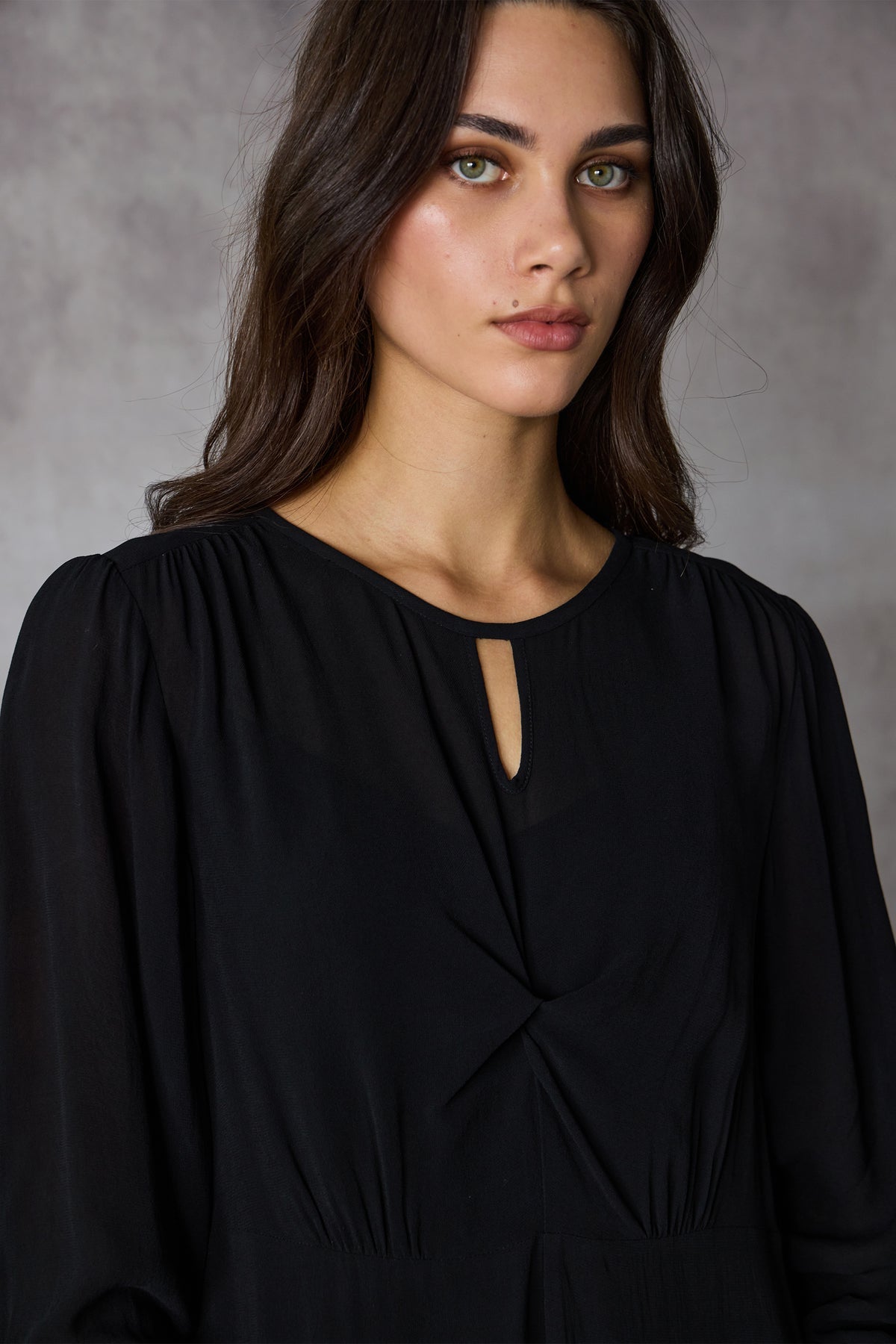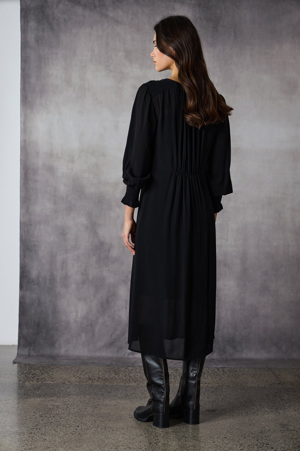 The Shadow Dress is a slimline midi featuring a shaped underbust seam for a flattering fit. A keyhole opening with a front twist adds subtle allure, while softly gathered full-length sleeves with deep shirred cuffs complete the look. A timeless piece that exudes elegance and sophistication.