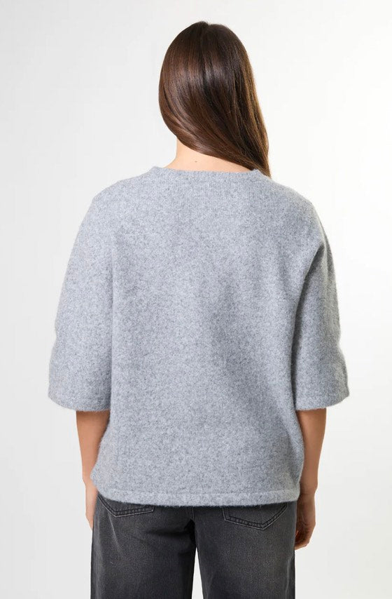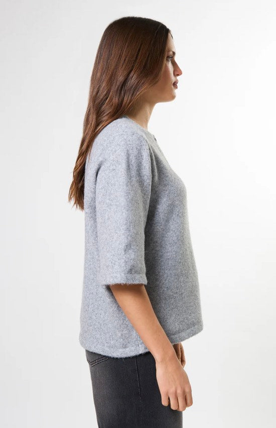 Crew neck boxy button front cardigan with wide elbow length sleeve.