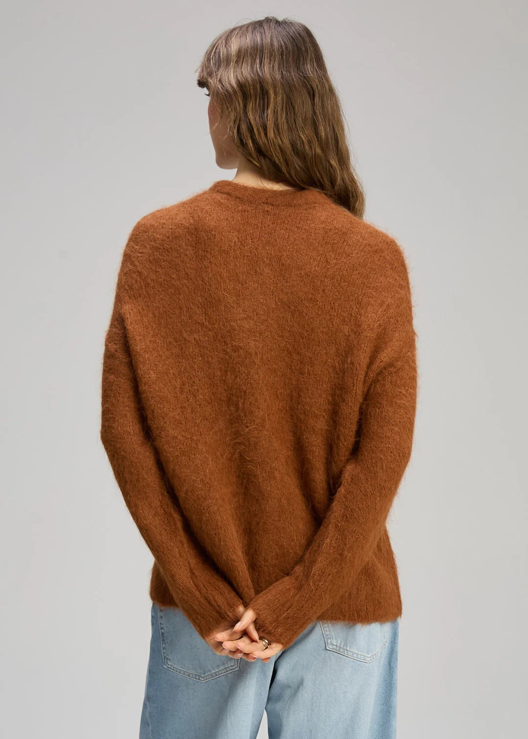 Crafted from a luxurious alpaca blend, it offers a gentle, breathable warmth and a refined drape. The relaxed silhouette sits comfortably on the body, making it easy to wear on its own or layered under coats and jackets. It’s a timeless knit that feels both cosy and polished.
